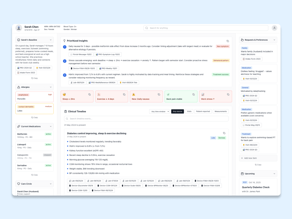I design clinician dashboards, EHR workflows, and patient tools that turn complex clinical data into clear, actionable views—so teams can focus on care, not wrestling with software. With an MS in Human Factors Engineering (medical devices & systems), I bridge product, clinical, and engineering perspectives to ship safe, intuitive, and scalable digital health products.